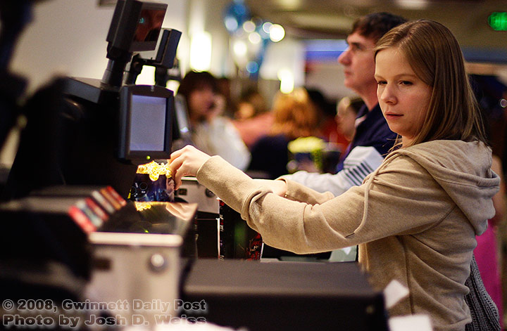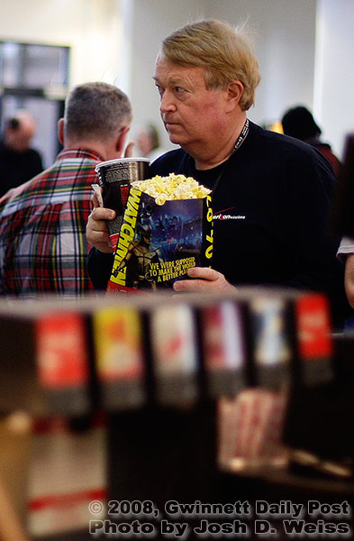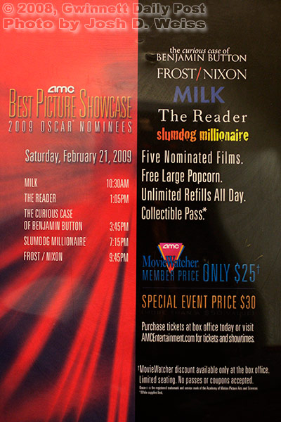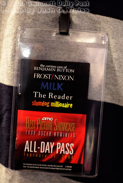 A local movie theater was screening all 5 of the nominees for “Best Picture” for this year’s Oscars.  Don’t get me started about sitting in a movie theater for nearly 13 hours, but the people there seemed to enjoy it.  The theater had their employees dress up for the event, hence the pink formal dress below.