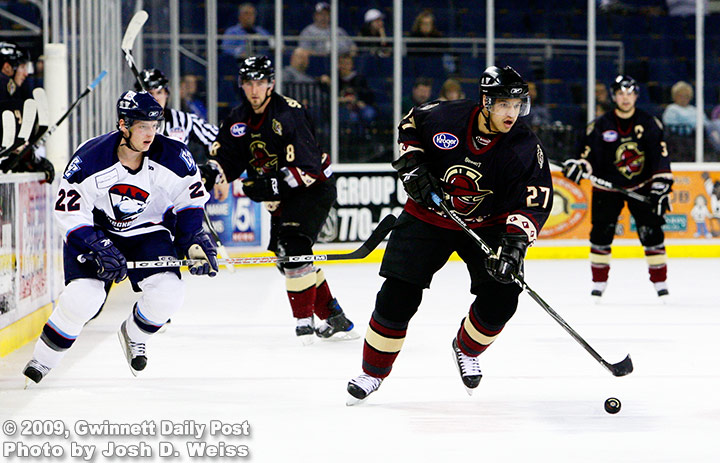 Yesterday I shot the Gwinnett Gladiators vs. Charlotte Checkers game at the Arena at Gwinnett Center. I used the first part of the game to try and get the more standard shots because you can run those in the paper and not have to worry about how large they will run since people know right away what they are looking at.