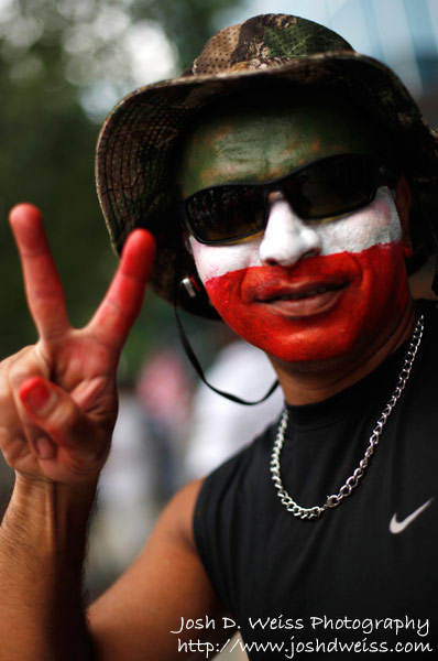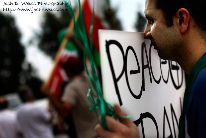 Thank you so much for taking such great pictures. It is true that there were two different sides at the protest. As many know, there are many political parties and positions in Iran. We went there to chant for peace and freedom for Iran. We wore the color green and released green balloons in the sky. Green is now the color of a freedom movement in Iran. It no longer represents Moussavi for many. People protesting in IRAN are wearing Green because they are not able to make any other bold statements and they are obviously not allowd to wear the original Persian flag. We were wearing Green to follow those IN OUR COUNTRY who are fighting for freedom. We got many insults that we were part of the Islamic Republic because we were wearing this color. We ourselves know that this isnt true and we know that we want peace and freedom and by protesting we know that we aren’t going to get the message across by yelling “death…to this and death to that” It’s just not effective and it makes people seem just as violent as those who are killing people in Iran.