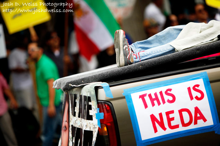 Thanks for the great photos. I was there – expressing my support for the brave people of Iran. I was deeply moved (to tears), just being on the street, holding a photo of Neda, green balloons, and the flag of Iran, imagining I was on the streets of Tehran. Their courage, fighting for freedom for Iran, has inspired the world.
