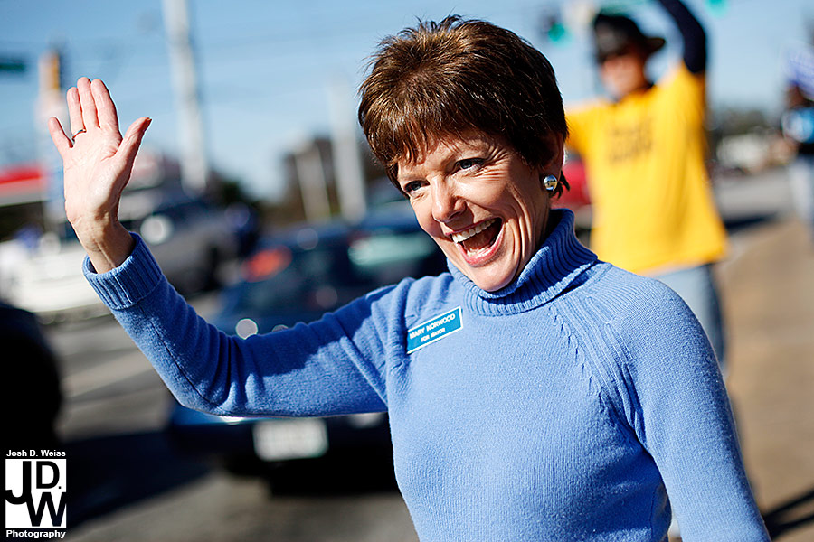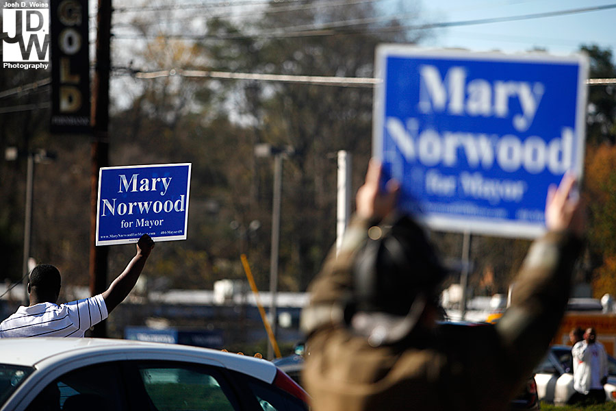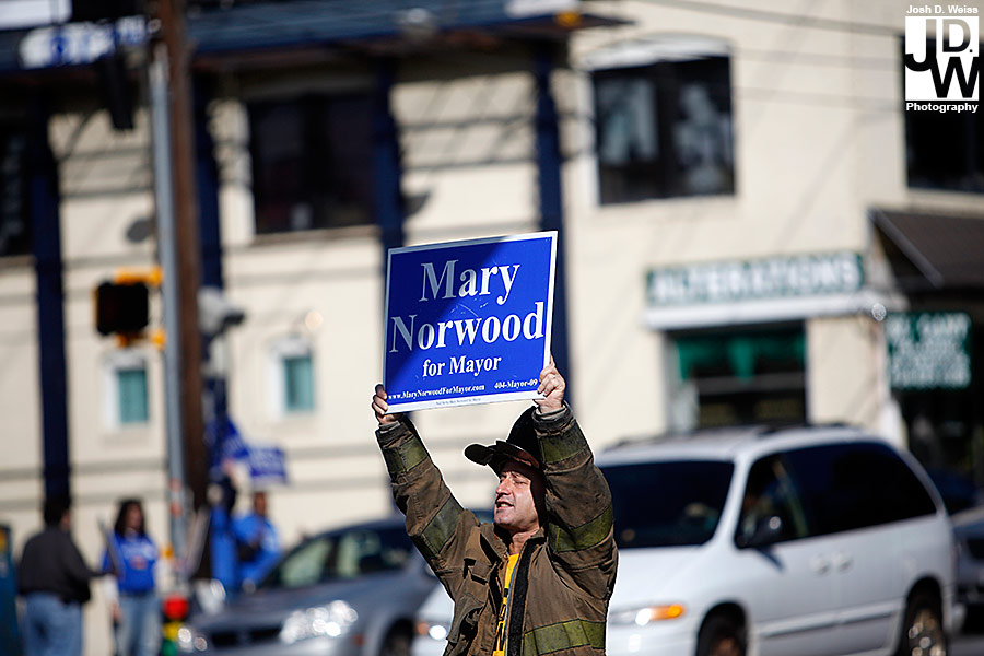 One of my assignments on Saturday for the AJC was to cover Atlanta Mayoral Candidate Mary Norwood’s publicity event at the intersection of Monroe and Piedmont in Midtown. Norwood walked up and down the sidewalk waving at drivers and sometimes talking to them after they’d roll down their windows.