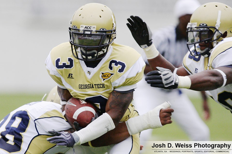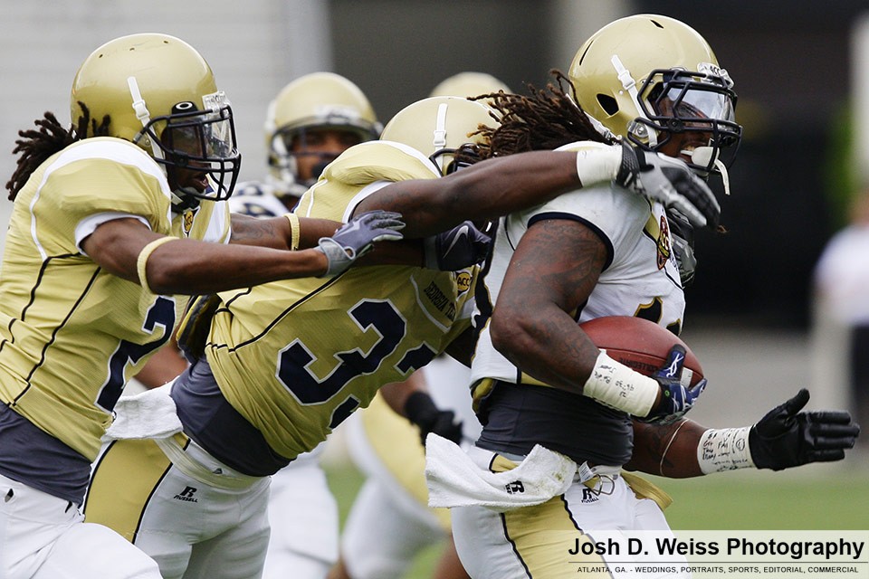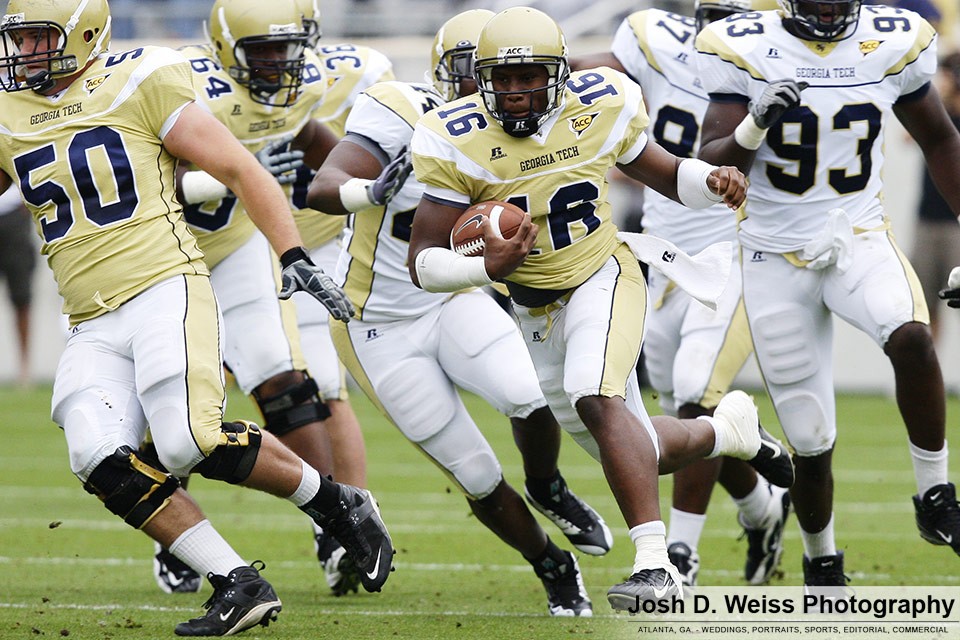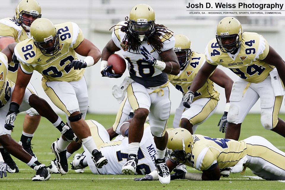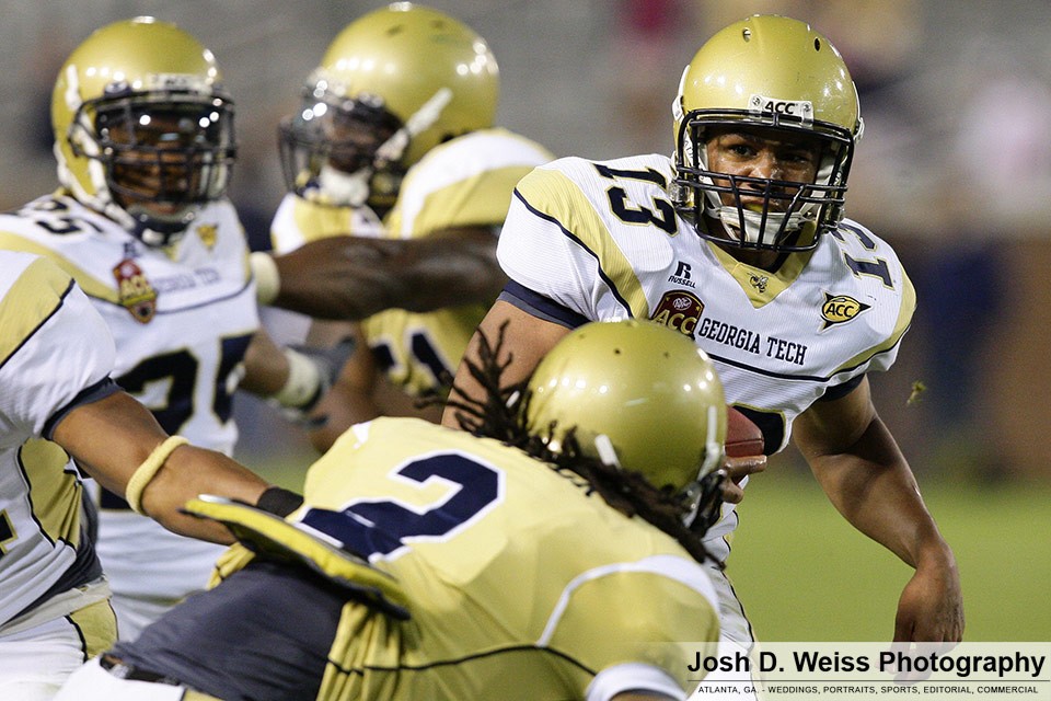 Saturday was Georgia Tech’s annual T-Day game, which marks the final practice of the spring for the football team. It is the third of three team scrimmages and the only one open to the public. It is held in Bobby Dodd Stadium. Last year was the first time I shot the game (see here).