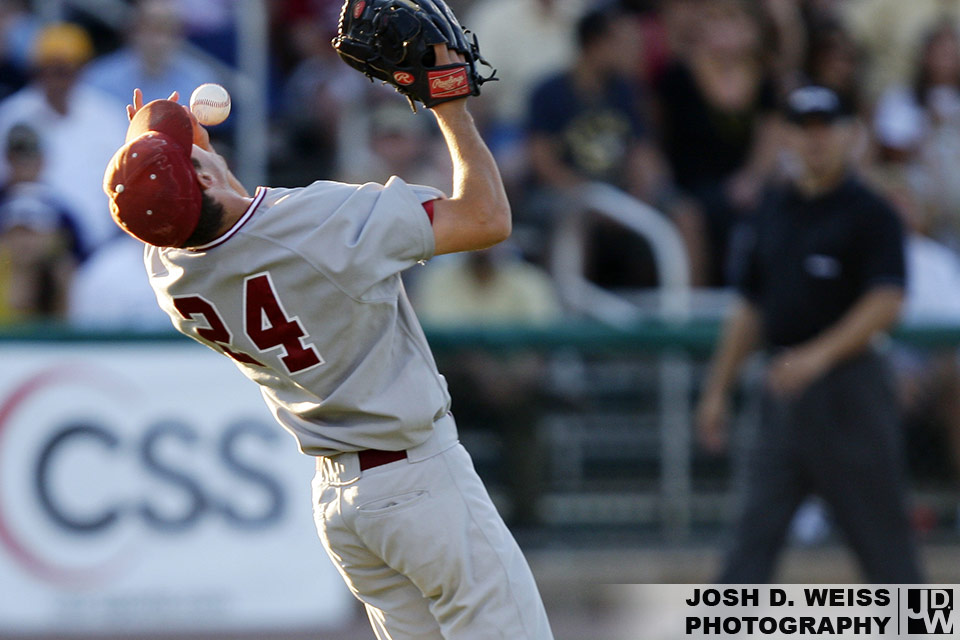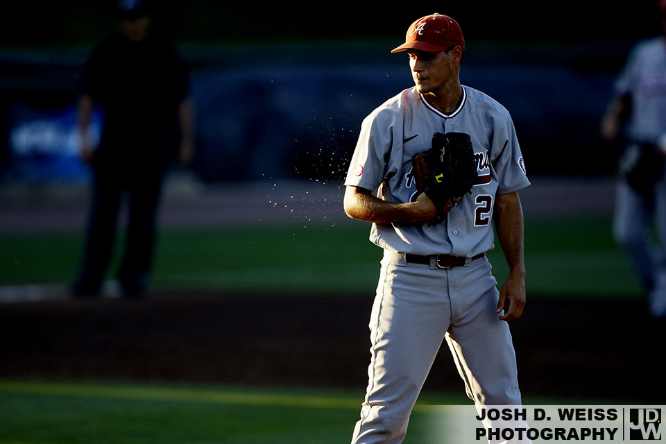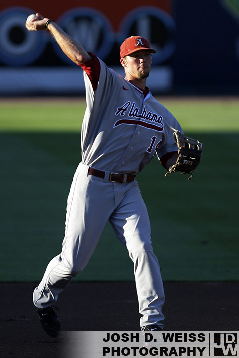 Over the weekend I shot the NCAA Atlanta baseball regionals for Elon University, The Macon Telegraph and US Presswire. Normally I’d post the other days first, but I decided to jump straight to the championship game. The Alabama Crimson Tide managed to fight back from a Saturday night loss to the Georgia Tech Yellow Jackets with a win over the Mercer Bears Sunday afternoon to take Tech on again Sunday night. The regional system is double elimination, so Alabama’s win forced a game 7 on Monday. Alabama, down early, clawed their way back to win and advance to the super regionals next week.