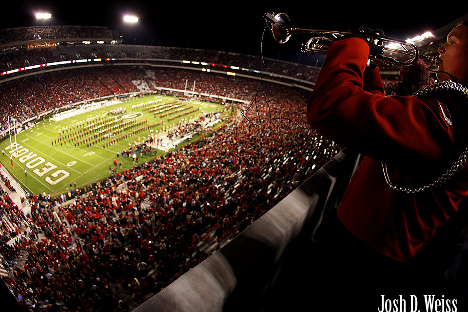 Shooting the game this year was a bit of a novelty for me since both The Macon Telegraph and US Presswire were both sending other photographers as well. Normally, I’m the only shooter for both at Tech games so I have to play it safe and stay on the field. This time, however, I was able to go up into the stands for a bit and try some things out. The main idea was to shoot the Red Coat who performs the opening notes of “Battle Hymn of the Republic” at the top of the stadium. I wanted to shoot from the TV deck too, but UGA changed their rules and wouldn’t allow sideline photo passes into the press box which was a major disappointment. After halftime I went up to the top of the stadium from the back of the U and shot from there as well.