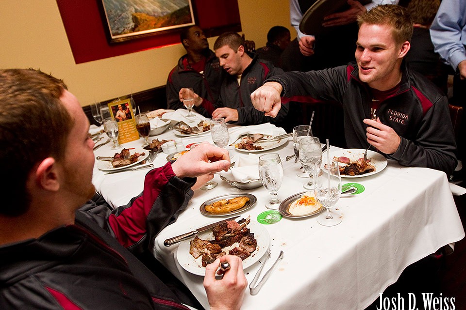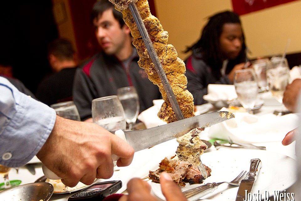 I meant to post this back in early January, and then other things kept coming up and so I never had a chance to until now. These were from the Chick-Fil-A Bowl coverage I helped out Paul Abell with. During the week leading up to the game, Florida State and South Carolina were both taken to Fogo de Chao, a Brazilian steak house in Buckhead, to see which team could eat the most meat. I forgot who won, but it certainly wasn’t the animals.